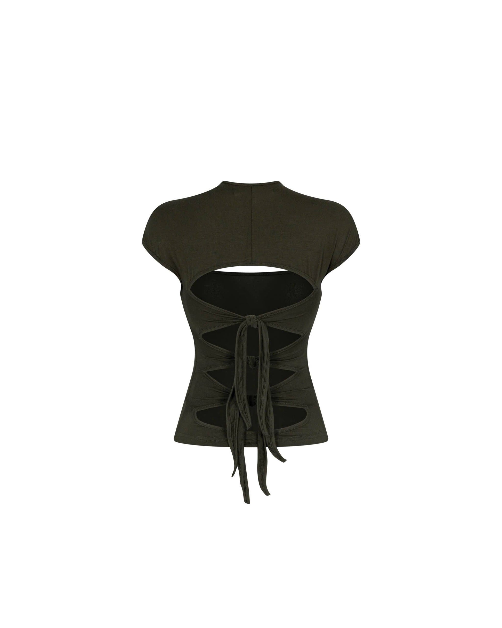 - Detail Features: High neckline with a front cut-out and small knot detail. Open back with three adjustable tie straps.