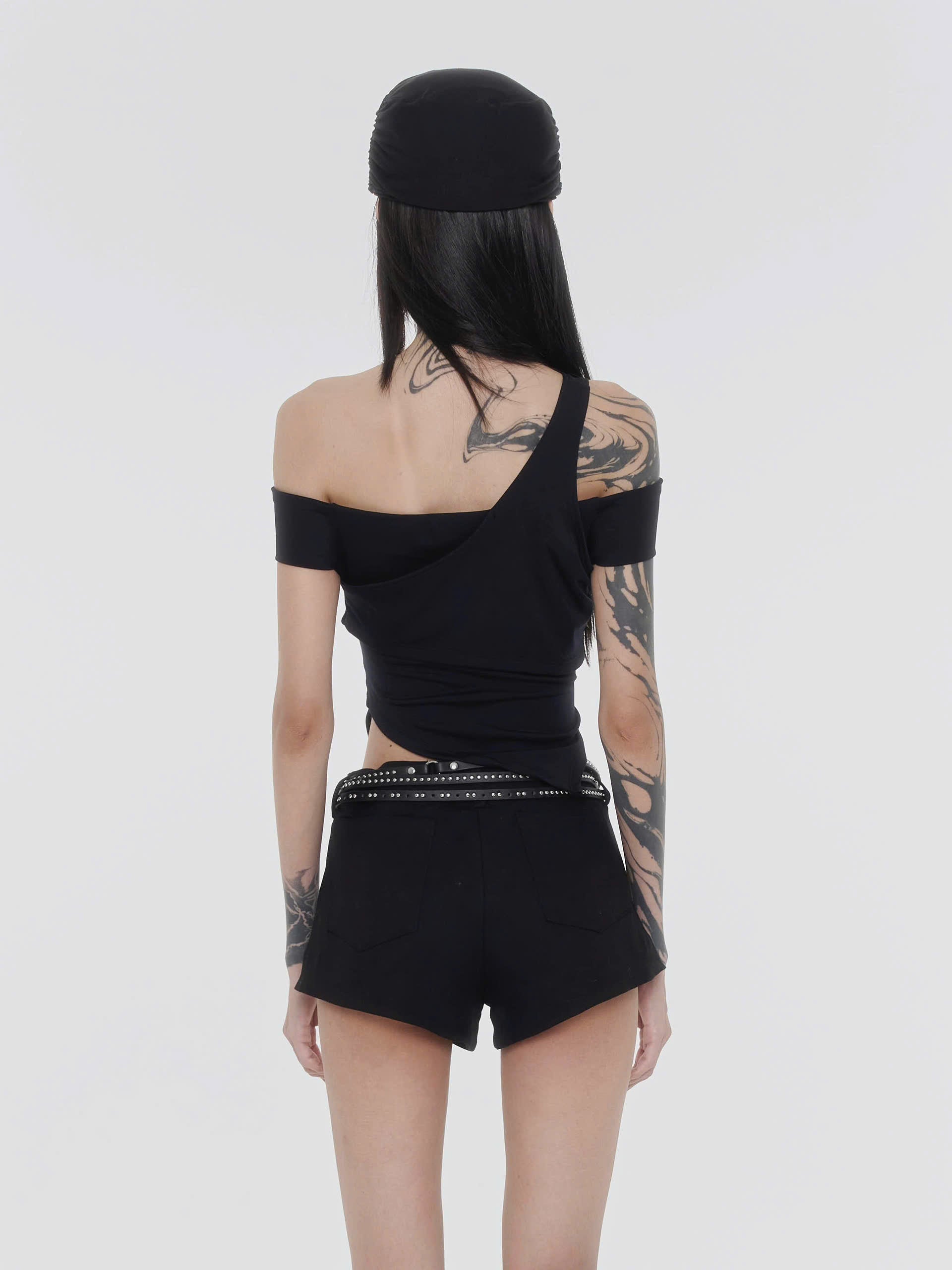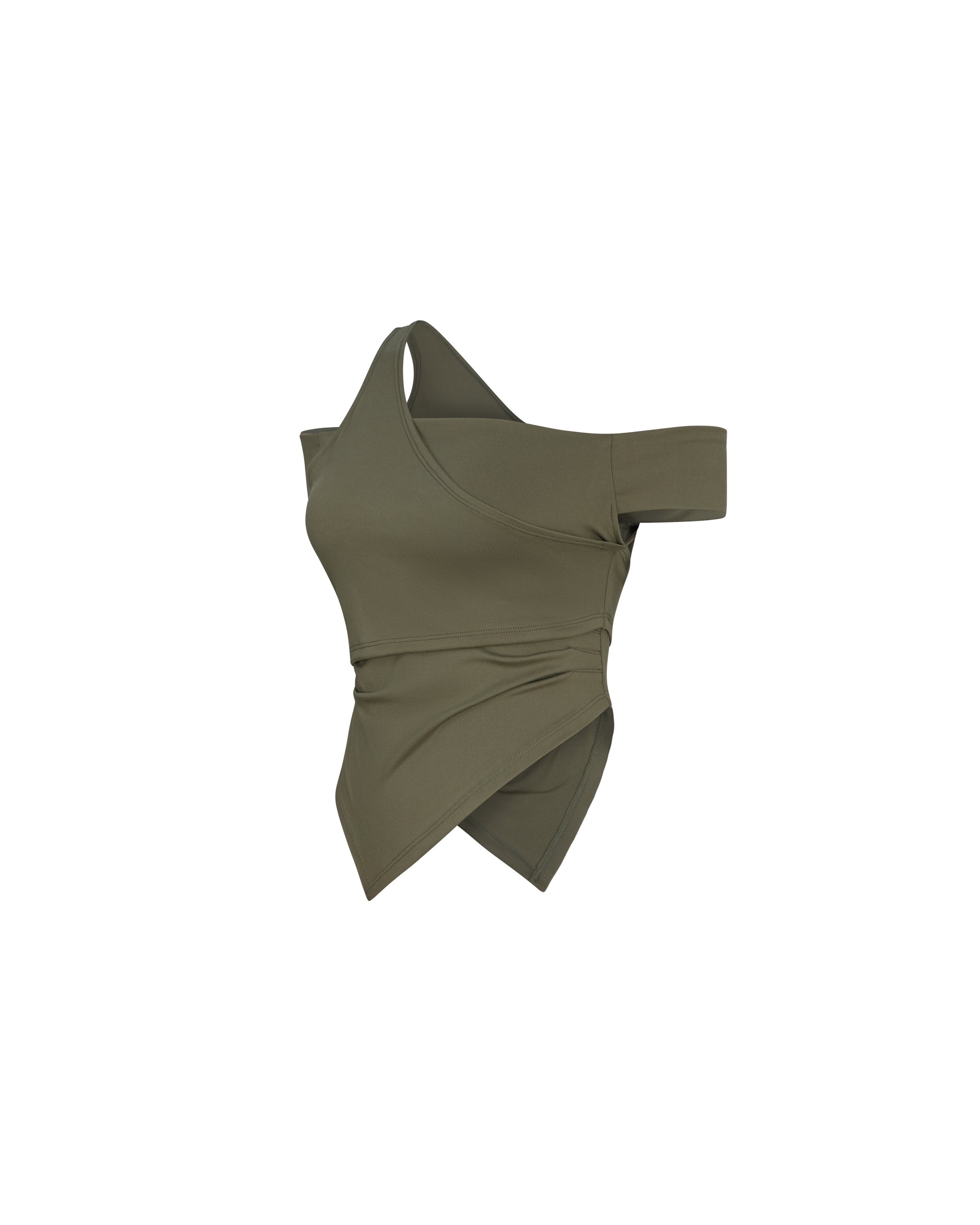 - Details Features: Pleated waist detail; Off-shoulder sleeve with pointed hem. Layered design; Asymmetric detailing. Soft, stretchy fabric