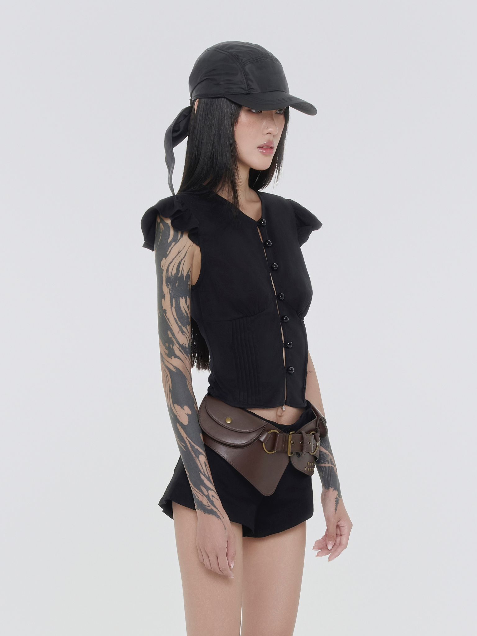 - Front button closure with glossy black buttons