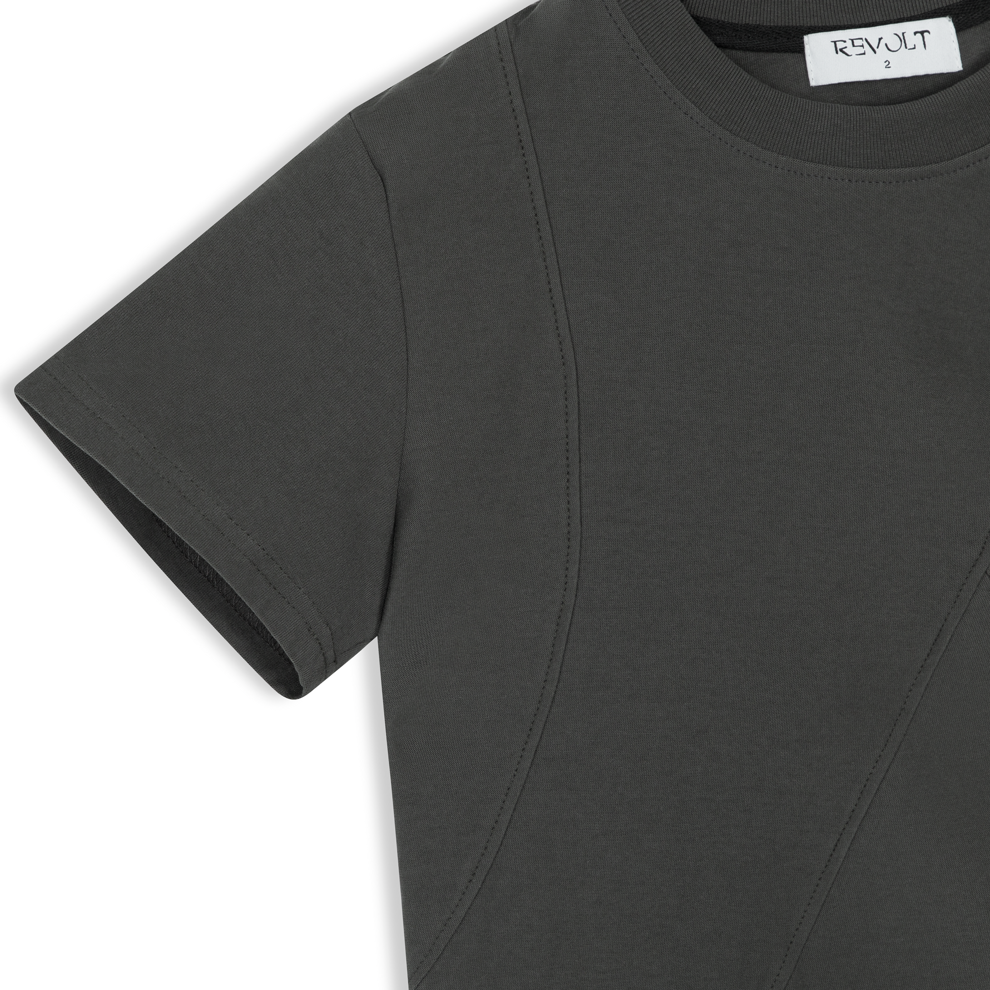 - Detailed Features: Boxy fit, mid-length cut, stitched accent lines across the shirt
