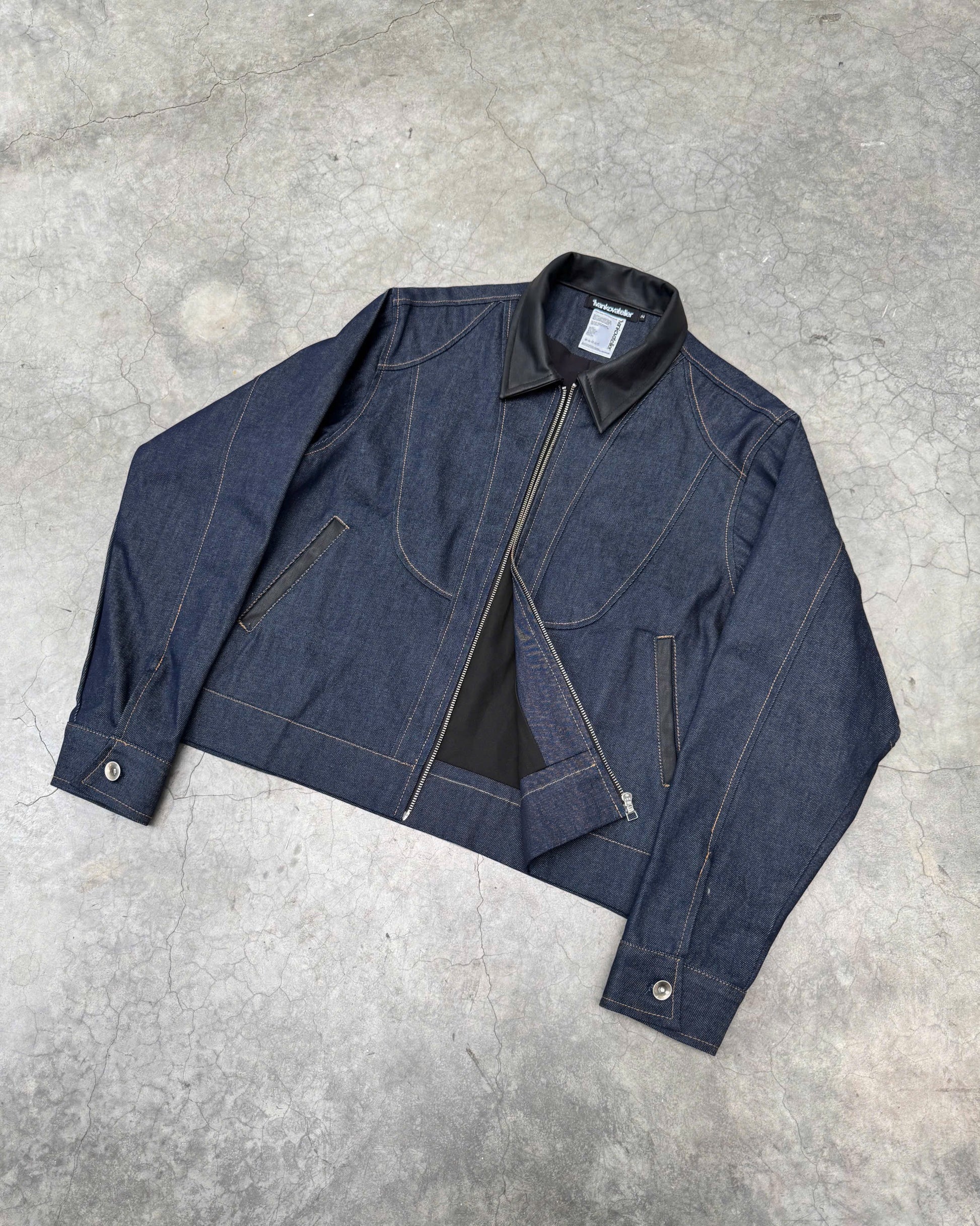- Detail Features: YKK zipper and washed metal button. Panel, deconstructed design. Leather collar. Two side pockets.